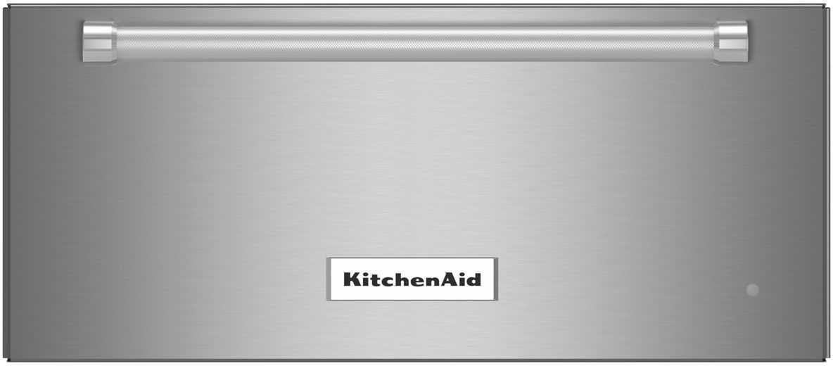 A bold blend of professionally-inspired styling and sleek touches for the home. The striking built-in warming drawer features Satin Textured Handles with iconic KitchenAid Brand Medallions.